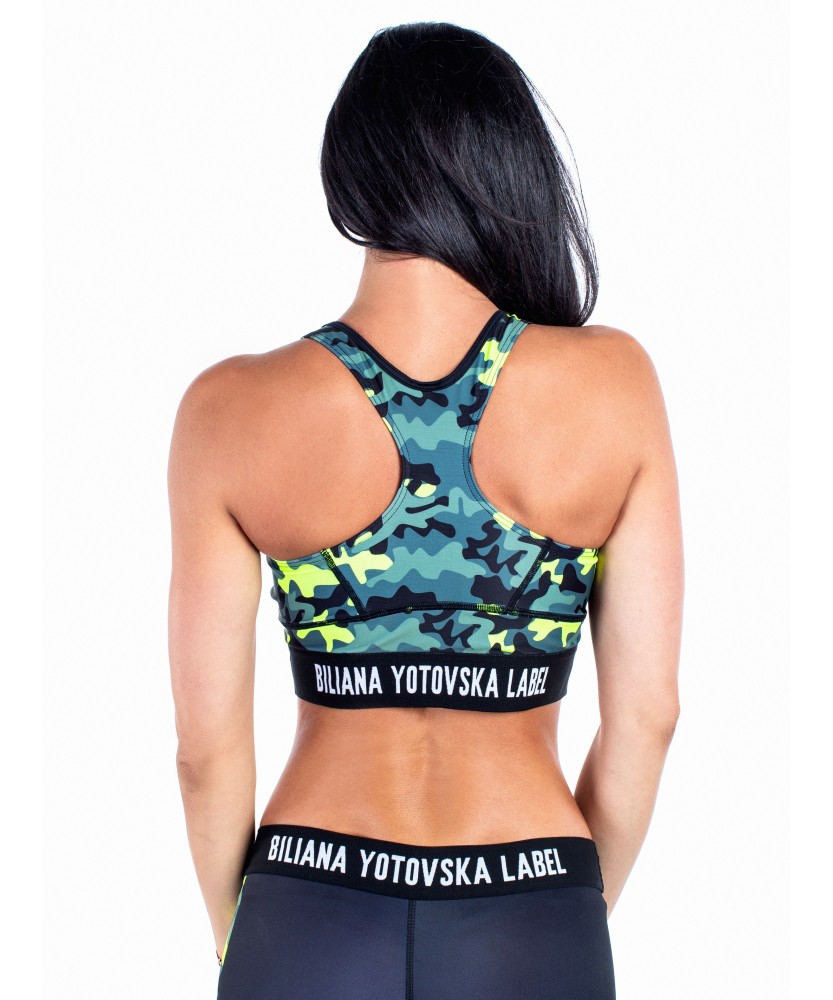 Бюстието има джобове за поставяне на подвижни подплънки и специална подплата.Атрактивния милитъри принт отново е на мода. Максималист във всичко, с което се захване, Биби е помислила и за най-дребните детайли! Колана е брандиран тъкан ластик. Кройката на бюстието е перфектно изпипана, за да пасне идеално на всяка тренираща дама! Непрозрачната, гладка, дишаща, стягаща, бързосъхнеща и еластична в двете посоки техническа материя Ви гарантира несравнимо усещане за лукс и комфорт. Идеята: изящество и максимален комфорт.